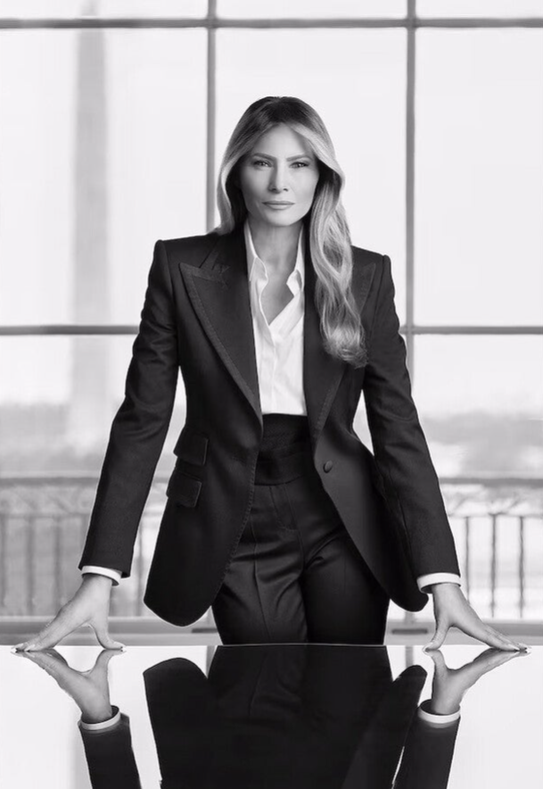 Naar verluidt zou Melania bijzonder trots zijn op haar jongste portret van de hand van de vermaarde Belgische fotografe Régine Mahaux. Als locatie werd the Yellow Oval Room gekozen. Strak in het zwarte pak, een deux pieces met getailleerde vest en broek, en met een flou in beeld gebracht Washington Monument op de achtergrond straalt de First Lady een en al power uit. Volgens kenners is het een hard portret, genomen vanuit een narcistisch perspectief: Melania oogt zowaar bovennatuurlijk, verheven boven de rest. Enfin, precies zoals de Trumps zich graag laten in beeld brengen.